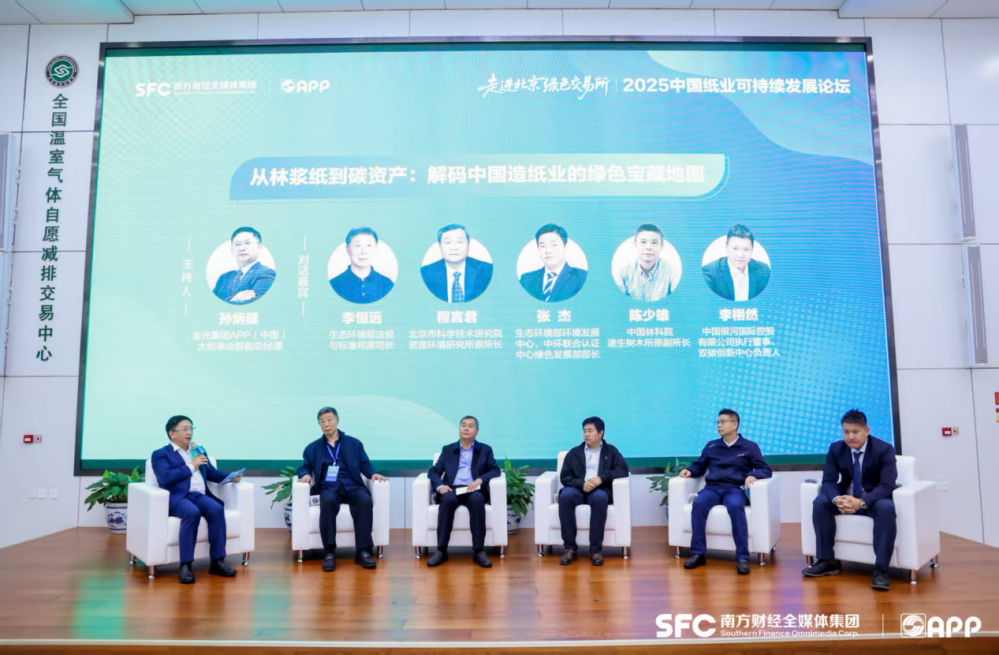 在主题对话环节,由金光APP(中国)大纸事业群副总经理孙炳健主持,生态环境部法规与标准司原司长李恒远,北京市科学技术研究院资源环境研究所原所长程言君,生态环境部环境发展中心、中环联合认证中心绿色发展部部长张杰,中国林科院速生树木所原副所长陈少雄,中国银河国际控股有限公司执行董事、“双碳”创新中心负责人李栩然,共同就“林浆纸到碳资产:解码中国造纸业的绿色宝藏地图”这一主题进行探讨。
