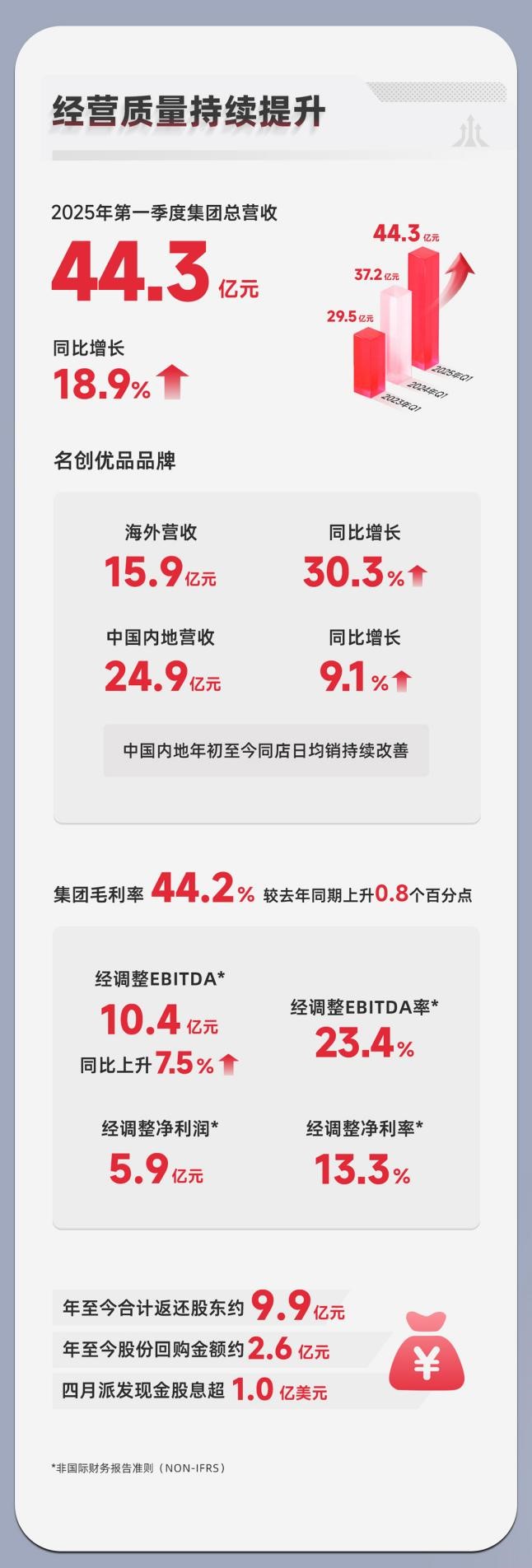 财报显示,第一季度名创优品集团总营收达到了44.3亿元,同比增长19%。该季度毛利率为44.2%,较去年同期上升0.8个百分点,录得过往第一季度的最高毛利率水平。在盈利能力方面,该季度经调整【非国际财务报告准则(Non-IFRS)】EBITDA为10.4亿元,同比上升7.5%,经调整EBITDA率为23.4%,经调整净利润5.9亿元,经调整净利率13.3%,全球化扩张的规模效应与精细化运营成效凸显。同时,名创优品集团年至今合计返还股东约9.9亿元,股份回购金额约2.6亿元,四月派发现金股息超1亿美元,基于长期战略与投资者共享发展红利,进一步夯实企业价值基石,为股东带来稳定和可预见的回报。