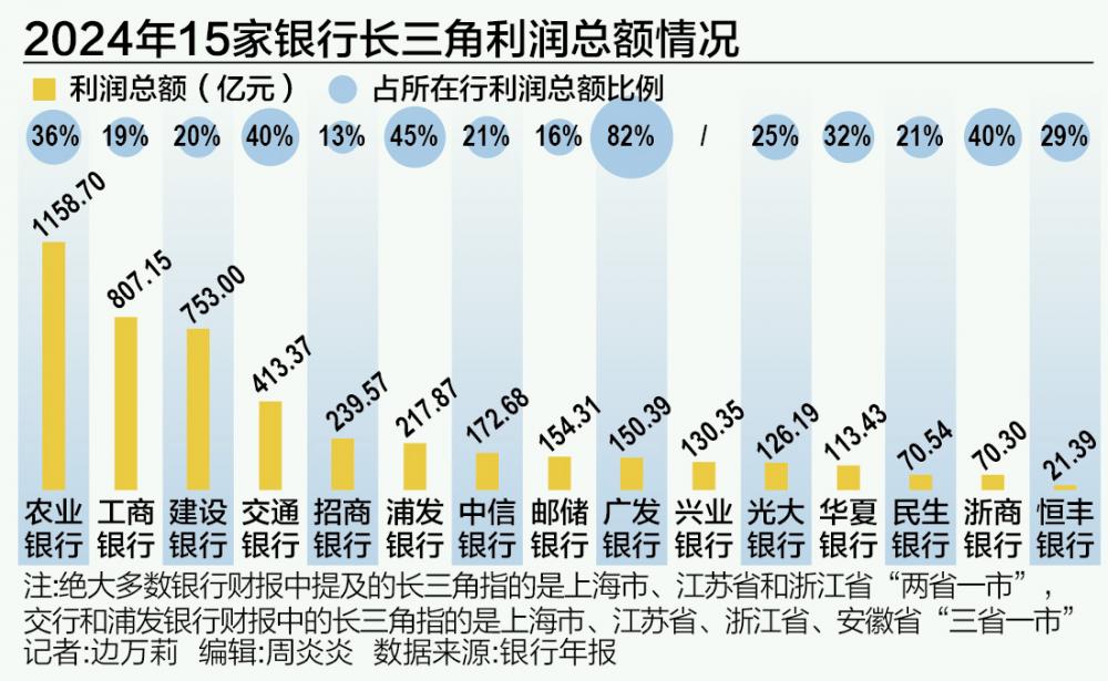 21世纪经济报道记者对国有大行和股份行2024年年报进行梳理发现,共有15家银行在财报中明确披露了长三角地区相关数据,涵盖营业收入、利润总额、资产规模、存贷款规模等指标。