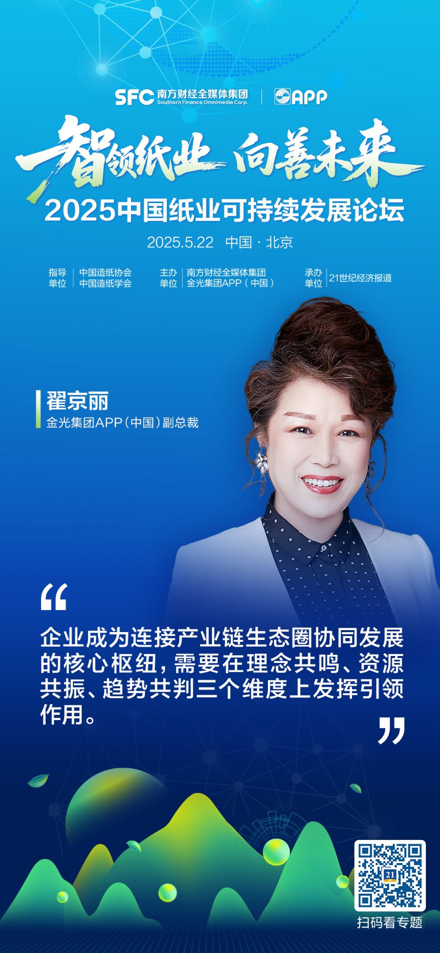 5月22日,由中国造纸协会、中国造纸学会指导,全球浆纸巨头金光集团APP(中国)携手南方财经全媒体集团主办、21世纪经济报道承办,以“智领纸业 向善未来”为主题的2025年中国纸业可持续发展论坛在京顺利举办。