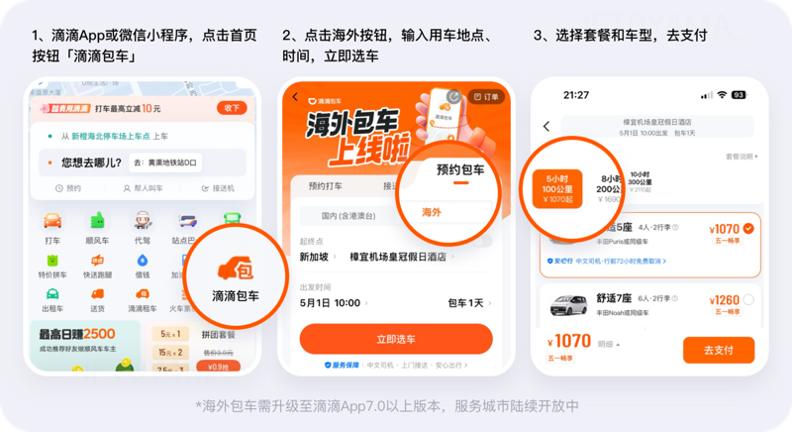 用户只需要打开滴滴出行APP或微信小程序,点击滴滴包车图标,在预约包车页面选择海外板块,输入起终点和用车时间,点击立即选车后,即可选择中意的车型和套餐。