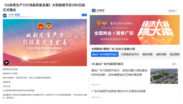 一是媒体融合成果显著,圆满完成全国两会报道。2024年全国两会期间,21世纪经济报道牢牢把握主旋律,精心策划,充分整合利用优势采编力量,合力呈现《南财全媒聚焦:2024年目标定了!——政府工作报告深度解析》《以新质生产力引领高质量发展》《全国两会·聚焦广东丨经济大省挑大梁》《“灯塔工厂”智造风云》等重磅报道,内容优质、形态丰富、传播得力,实现了全国两会报道的媒体融合、梯度传播、精准落地。