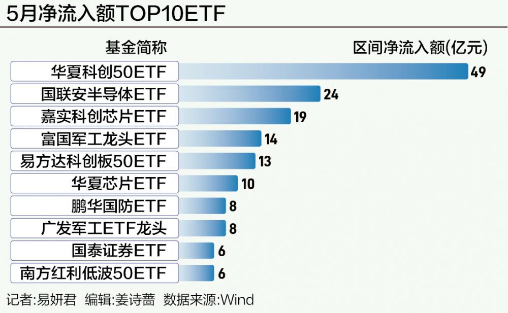 特别是以半导体、芯片、高端制造为代表的科技创新方向,相关ETF合计“吸金”规模超过200亿元。其中,华夏科创50ETF、国联安半导体ETF、嘉实科创芯片ETF的净流入额分别达到49.31亿元、23.6亿元、18.74亿元,为5月“吸金”规模排名前三的股票ETF。