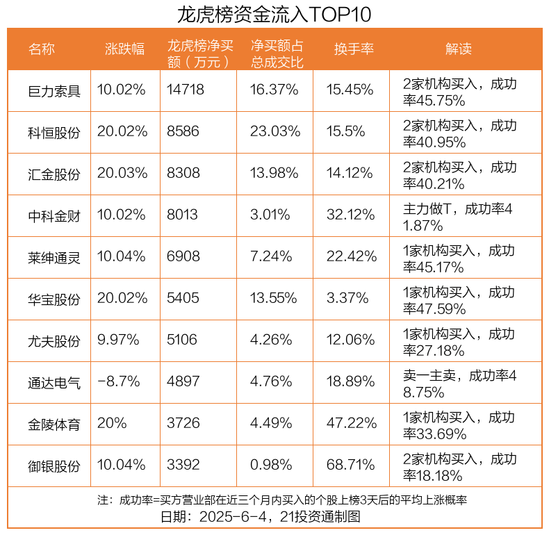 6月4日,上证指数上涨0.42%,深证成指上涨0.87%,创业板指上涨1.11%。盘后龙虎榜数据显示,共有44只个股因当日异动登上龙虎榜,资金净流入最多的是巨力索具(002342.SZ),达1.47亿元。