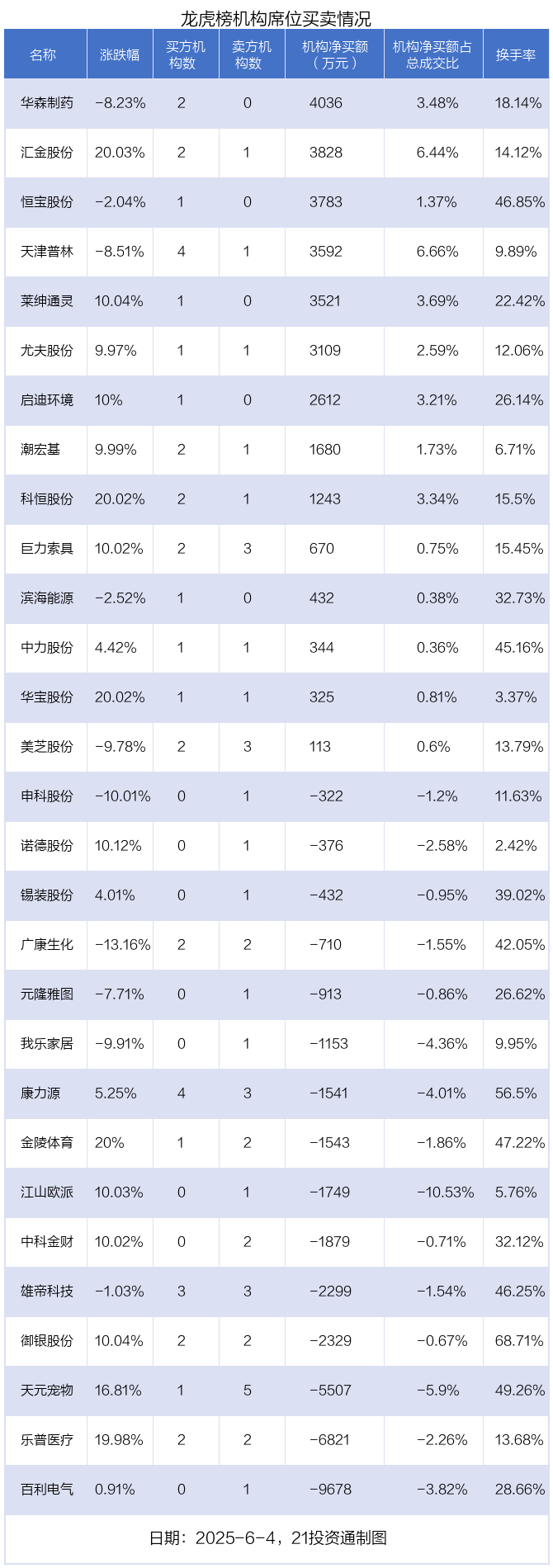 其中,机构净买入金额最多的是华森制药(002907.SZ),当日收盘下跌8.23%,换手率为18.14%。