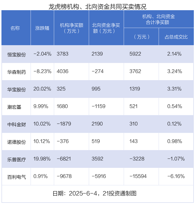 值得注意的是,机构和北向资金共同净买入了恒宝股份、华宝股份等2股;共同净卖出了百利电气;在乐普医疗,中科金财,诺德股份,华森制药,潮宏基上出现分歧,机构净卖出乐普医疗6820.78万元,北向资金净买入3592.43万元;机构净卖出中科金财1879.27万元,北向资金净买入2189.53万元;机构净卖出诺德股份376.22万元,北向资金净买入519.44万元;机构净买入华森制药4036.35万元,北向资金净卖出274.01万元;机构净买入潮宏基1680.34万元,北向资金净卖出1159.35万元。