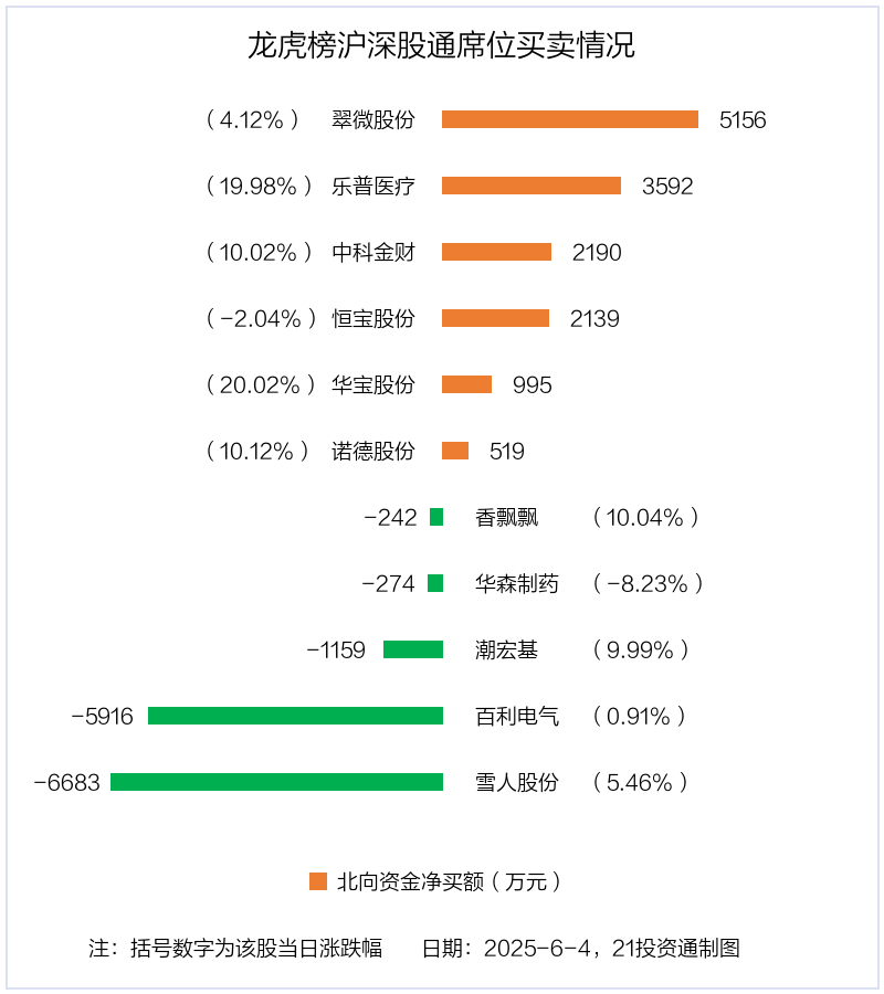 6月4日,北向资金参与龙虎榜中的个股共有11只,合计净买入316.84万元。其中沪股通净买入2 股,净卖出2 股,合计净卖出483万元;深股通净买入4 股,净卖出3 股,合计净买入799.84万元。