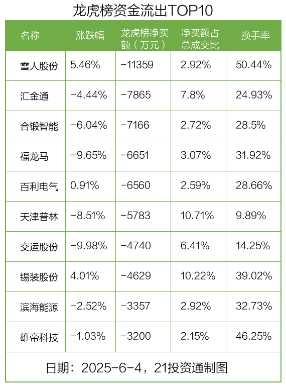 而龙虎榜中资金净流出最多的是雪人股份(002639.SZ),被净卖出为1.14亿元,占总成交金额的2.92%。雪人股份收盘换手率50.44%。