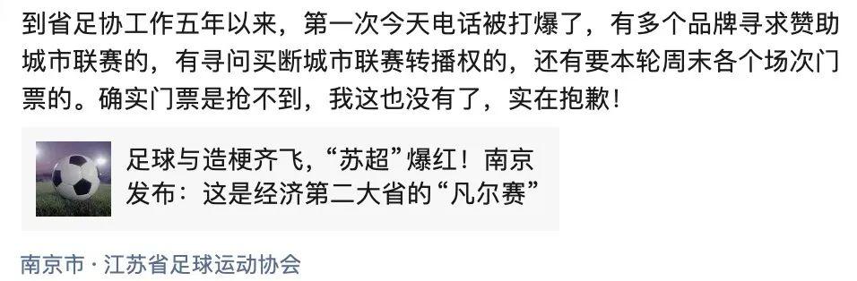 “到江苏省足协工作五年以来,第一次电话被打爆了,”他不得不发了个朋友圈:我这儿也没门票了,非常抱歉!