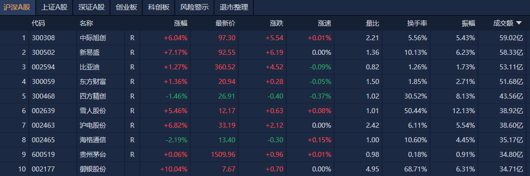 个股方面,中际旭创、新易盛、比亚迪、东方财富成交额均在50亿元之上。