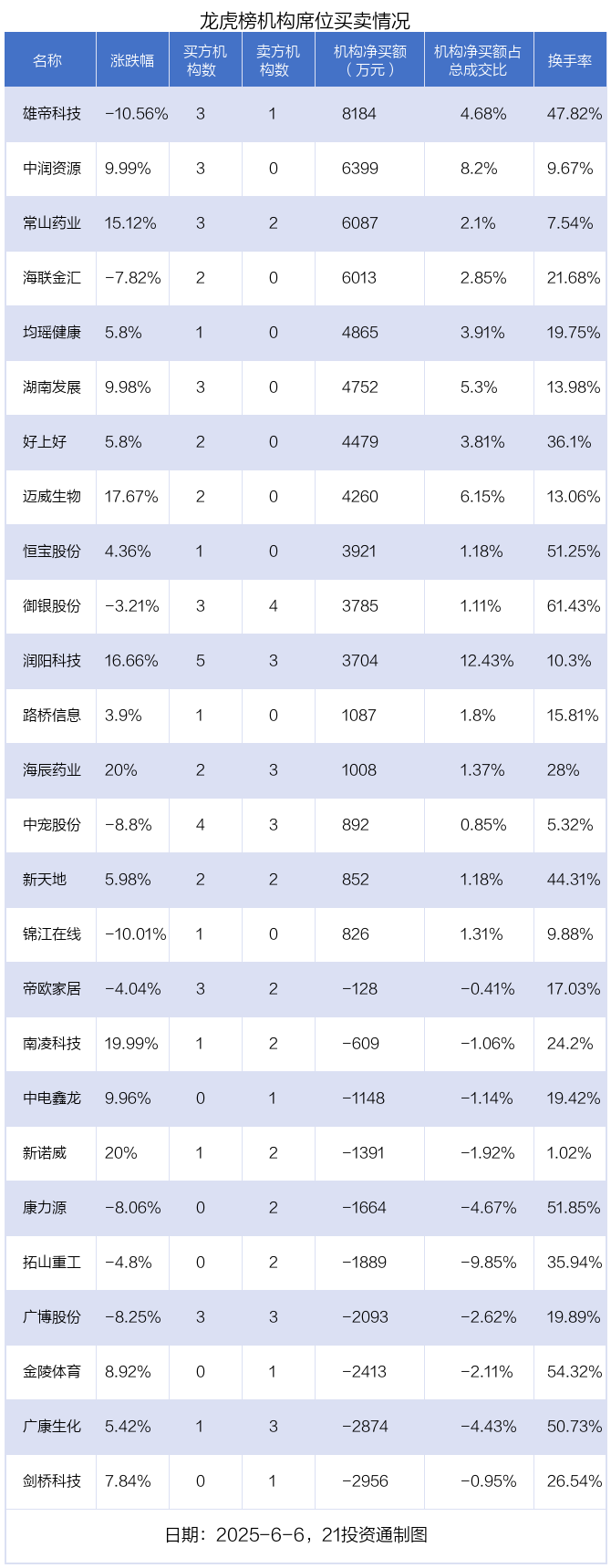 其中,机构净买入金额最多的是雄帝科技(300546.SZ),当日收盘下跌10.56%,换手率为47.82%。