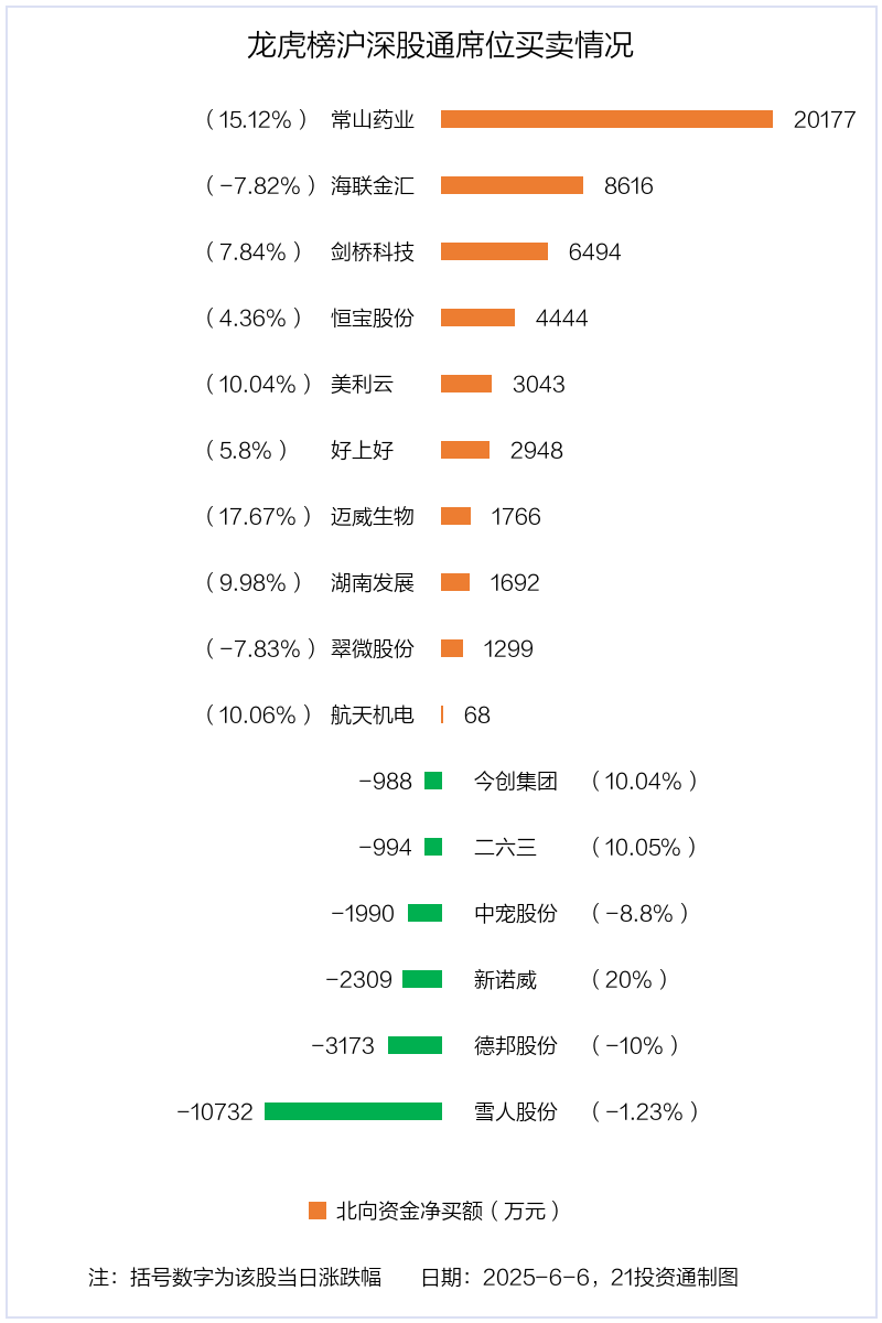 6月6日,北向资金参与龙虎榜中的个股共有16只,合计净买入3.04亿元。其中沪股通净买入4 股,净卖出2 股,合计净买入5465.9万元;深股通净买入6 股,净卖出4股,合计净买入2.49亿元。