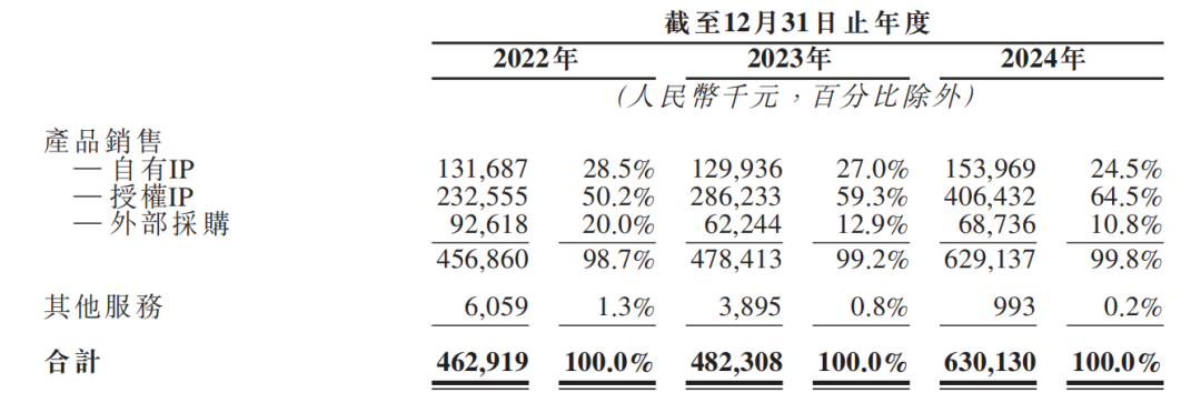翻开52TOYS的招股书,一组数据也格外刺眼,2024年其自有IP收入占比仅 24.5%,授权IP贡献了64.5%的营收。以其核心爆款“蜡笔小新”系列为例,2024年,公司营收为6.30亿元,而蜡笔小新玩具整体实现GMV超过3.8亿元。这意味着,公司2024年6成营收大致可以看作是由蜡笔小新贡献的。