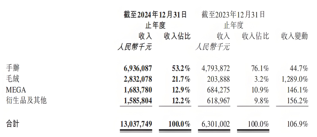 头部企业的产品矩阵正在发生质变。从泡泡玛特的财报也能看出,其已经形成“盲盒+手办+MEGA珍藏系列+衍生品”的四维结构,其中MEGA系列贡献16.8亿元,占比12.9%,成为高端市场的破局点。
