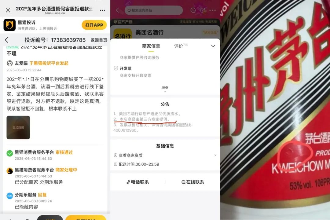 比如,美团销售的普茅存在货不对版的问题。有用户收到的是43°茅台(京东售价只有800多元)和海外版茅台(京东售价只有1700元),与宣传的普茅有很大差异。
