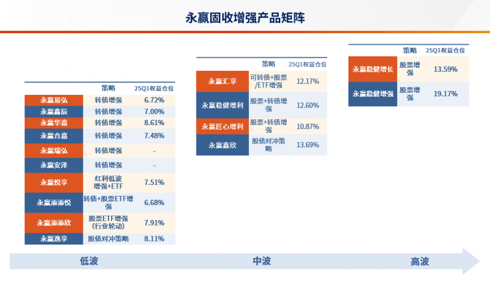 按照客户的波动率要求,永赢基金还提供低波、中波、高波的完整解决方案。高波策略优先选择长期收益较高的资产,比如转债。中波产品则会提高纯债仓位降低波动,以提高客户的持有体验。