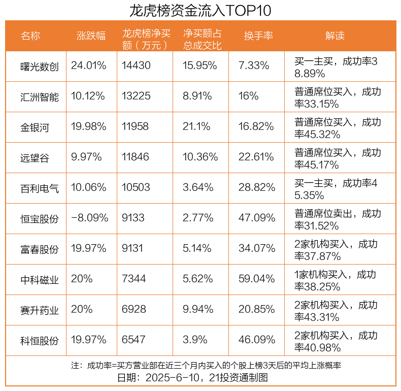 6月10日,上证指数下跌0.44%,深证成指下跌0.86%,创业板指下跌1.17%。盘后龙虎榜数据显示,共有54只个股因当日异动登上龙虎榜,资金净流入最多的是曙光数创(872808.BJ),达1.44亿元。