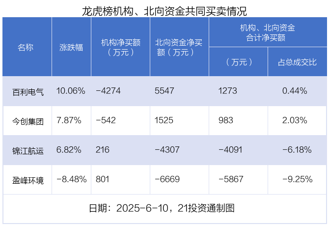 值得注意的是,机构和北向资金在百利电气,今创集团、锦江航运、盈峰环境上出现分歧,机构净卖出百利电气4273.96万元,北向资金净买入5547.4万元;机构净卖出今创集团542.24万元,北向资金净买入1525.16万元;机构净买入锦江航运215.63万元,北向资金净卖出4306.81万元;机构净买入盈峰环境801.25万元,北向资金净卖出6668.63万元。