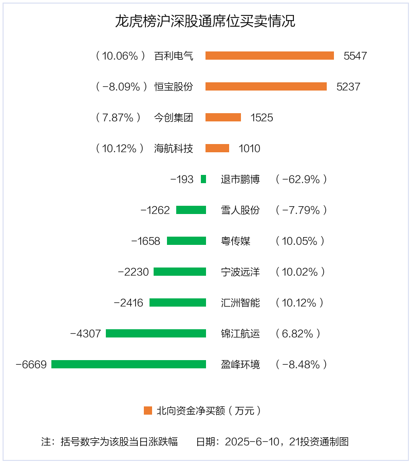 6月10日,北向资金参与龙虎榜中的个股共有11只,合计净卖出5414.63万元。其中沪股通净买入3股,净卖出3股,合计净买入1352.85万元;深股通净买入1股,净卖出4股,合计净卖出6767.48万元。