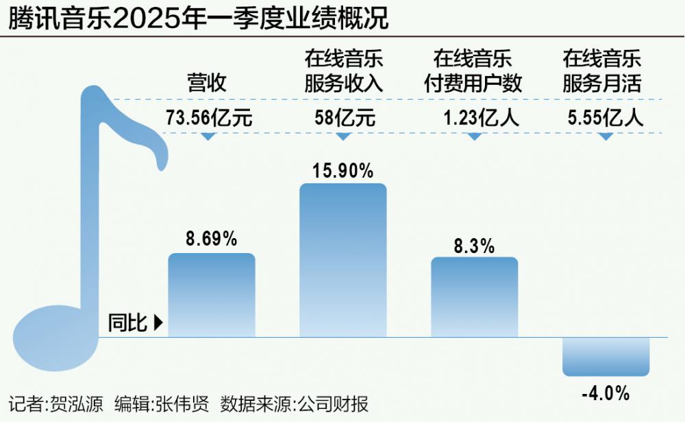 在2025年一季度,腾讯音乐营收73.56亿元,同比增长8.7%;调整后净利润22.26亿元,同比增长22.8%。