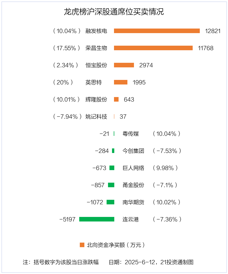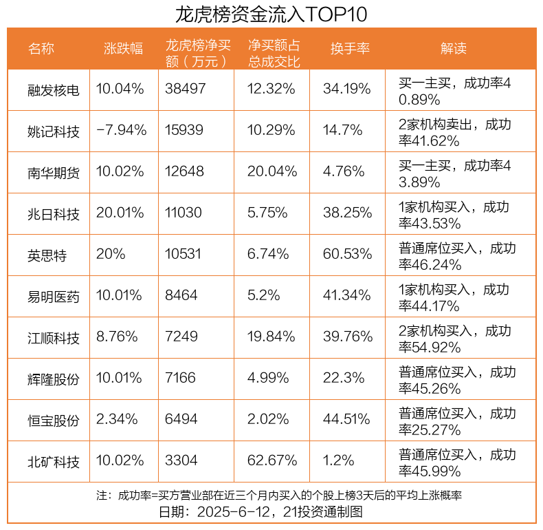6月12日,上证指数上涨0.01%,深证成指下跌0.11%,创业板指上涨0.26%。盘后龙虎榜数据显示,共有42只个股因当日异动登上龙虎榜,资金净流入最多的是融发核电(002366.SZ),达3.85亿元。