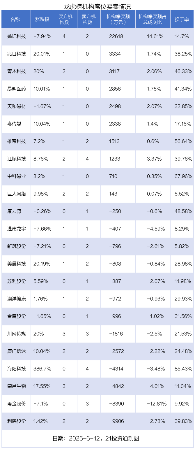 其中,机构净买入金额最多的是姚记科技(002605.SZ),当日收盘下跌7.94%,换手率为14.7%。
