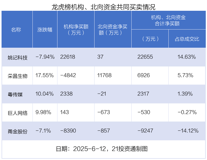 值得注意的是,机构和北向资金共同净买入了姚记科技等1股;共同净卖出了甬金股份;在荣昌生物,粤传媒,巨人网络上出现分歧,机构净卖出荣昌生物4842.11万元,北向资金净买入1.18亿元;机构净买入粤传媒2337.71万元,北向资金净卖出20.98万元;机构净买入巨人网络143.3万元,北向资金净卖出673.13万元。