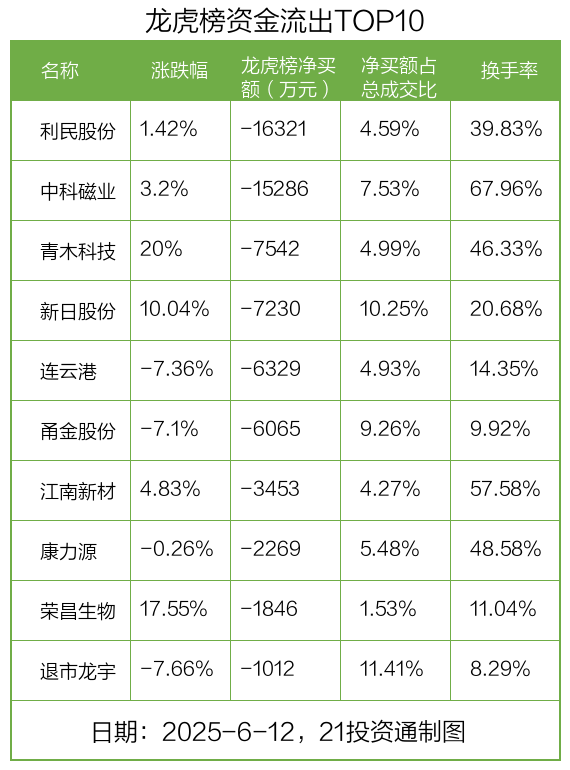而龙虎榜中资金净流出最多的是利民股份(002734.SZ),被净卖出为1.63亿元,占总成交金额的4.59%。利民股份收盘上涨1.42%,换手率为39.83%。