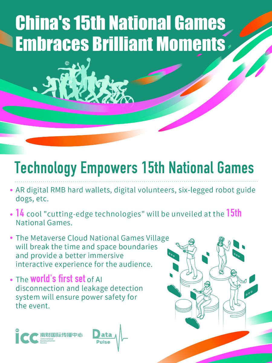 Guided by the principles of "Green, Inclusive, Open and Clean", China's 15th National Games features a dazzling array of technological innovations such as AR digital RMB hard wallets, digital volunteers, six-legged robot guide dogs, and the Metaverse Cloud National Games Village, with a view to presenting a more fashionable, environmentally friendly, and wonderful sports event to the world.
