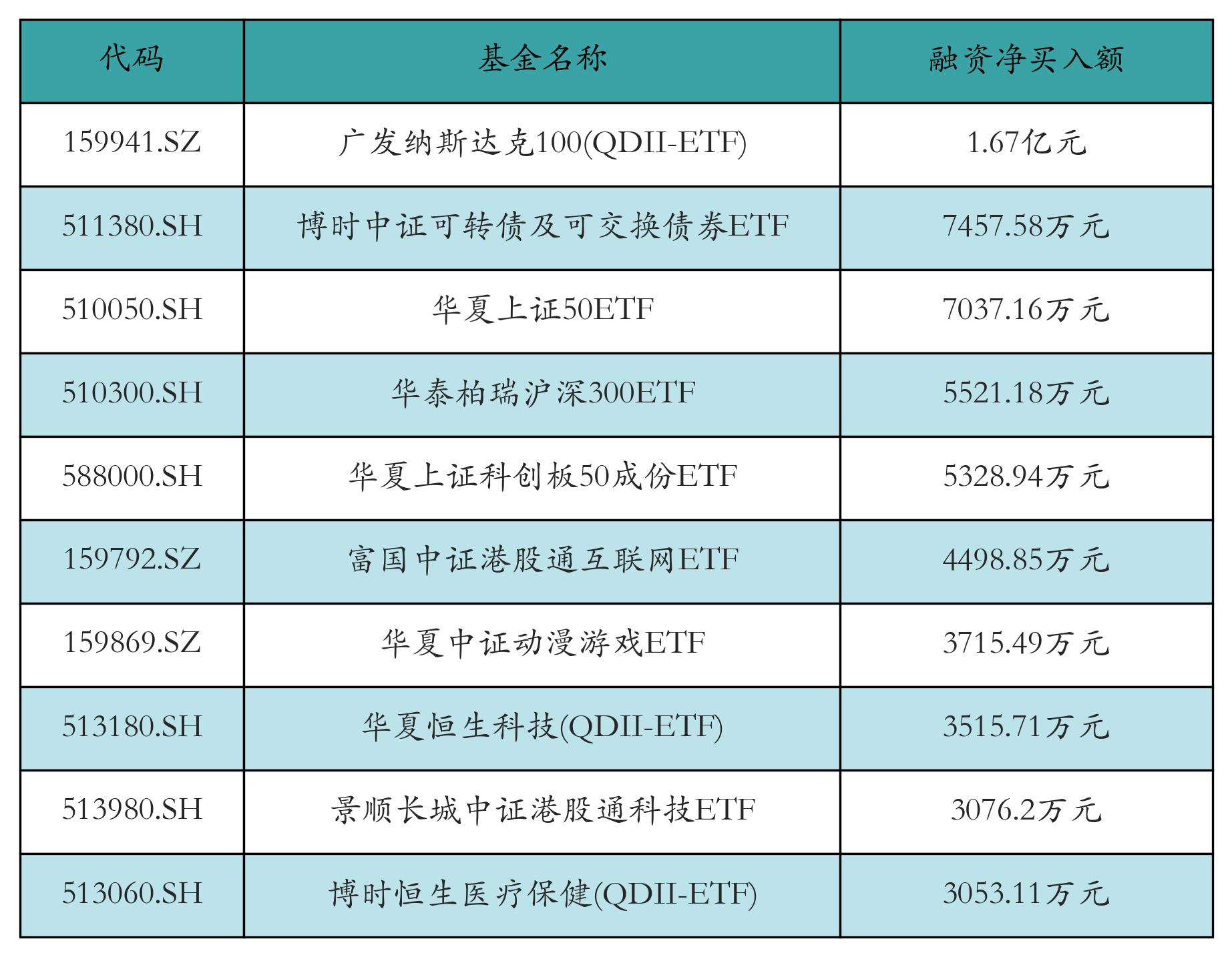 6月16日ETF融资净买入额前三位分别为:广发纳斯达克100(QDII-ETF)(1.67亿元)、博时中证可转债及可交换债券ETF(7457.58万元)和华夏上证50ETF(7037.16万元),前10具体见下表: