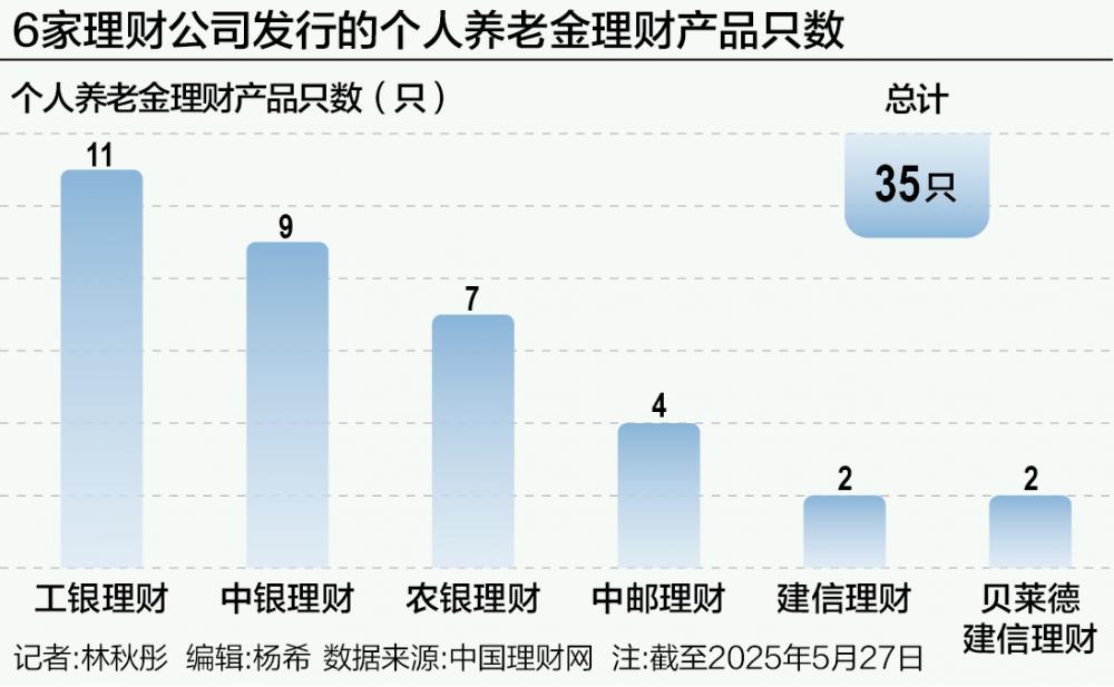 个人养老金理财产品再扩容。中国理财网数据显示,截至2025年5月27日,6家理财公司发行的个人养老金理财产品总只数达到了35只。工银理财、中银理财、建信理财、农银理财、中邮理财和贝莱德建信理财分别发行了11只、9只、2只、7只、4只和2只。其中,有6只为混合类产品,29只为固定收益类产品。