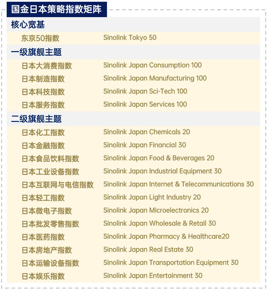 据Wind金融终端公开展示的信息,国金日本量化策略指数矩阵当前包含核心宽基指数“东京50”、一级旗舰主题指数4只、二级旗舰主题指数12只,较为全面地覆盖了日本股票市场的主要产业板块,能帮助投资者高效理清日本资本市场的产业投资脉络,并提供“一键布局”的指数化策略配置工具。
