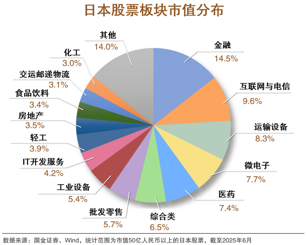 据国金指数介绍,国金日本量化策略指数矩阵中核心宽基指数“东京50”精选东京证券交易所具有代表性的50家上市公司,为投资者提供了覆盖日本市场核心资产的基准型投资工具。在细分产业领域,一级旗舰主题指数从宏观视角出发,聚焦综合行业板块;二级旗舰主题指数则全面覆盖日本市场重要细分行业板块。值得注意的是,国金日本量化策略指数矩阵多元且全面的研发构建,得益于国金行业分类体系对日股的精细化分类,准确地反映了上市公司在日本实体经济的划分。其中,在新纳入行业分类的日本股票中,金融、互联网与电信、运输设备、微电子、医药等行业板块位居板块市值前列,清晰反映了日本上市公司的主要产业分布,为指数研发提供了核心技术底座。