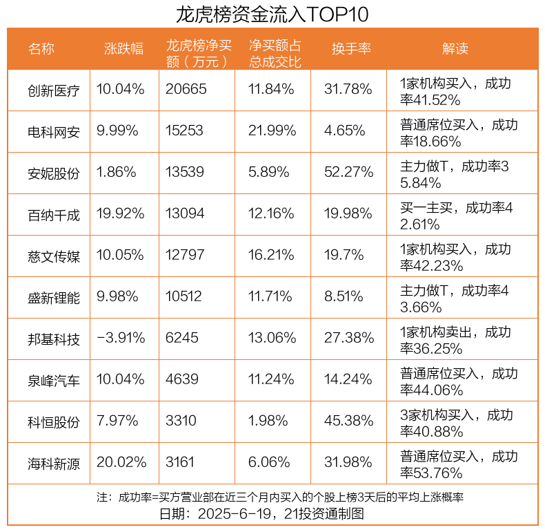 6月19日,上证指数下跌0.79%,深证成指下跌1.21%,创业板指下跌1.36%。盘后龙虎榜数据显示,共有55只个股因当日异动登上龙虎榜,资金净流入最多的是创新医疗(002173.SZ),达2.07亿元。