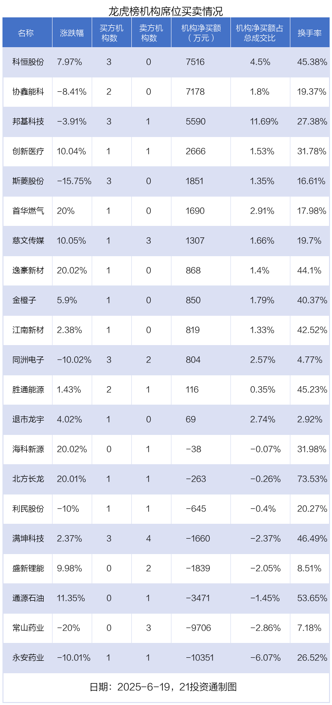 其中,机构净买入金额最多的是科恒股份(300340.SZ),当日收盘上涨7.97%,换手率为45.38%。