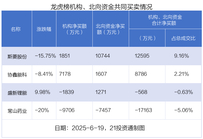值得注意的是,机构和北向资金共同净买入了斯菱股份、协鑫能科等2股;共同净卖出了常山药业;在盛新锂能上出现分歧,机构净卖出盛新锂能1839.34万元,北向资金净买入1271.29万元。