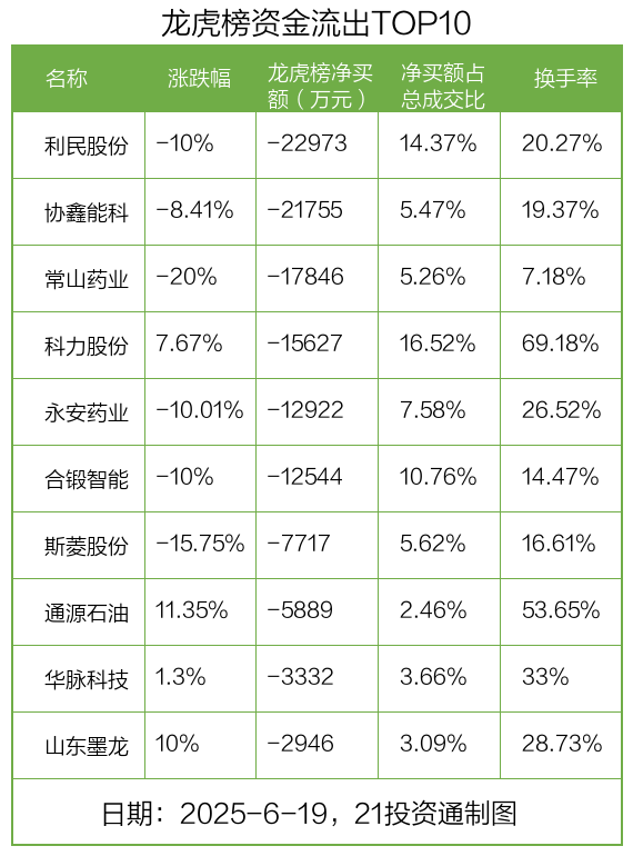 而龙虎榜中资金净流出最多的是利民股份(002734.SZ),被净卖出为2.3亿元,占总成交金额的14.37%。利民股份收盘下跌10%,换手率为20.27%。