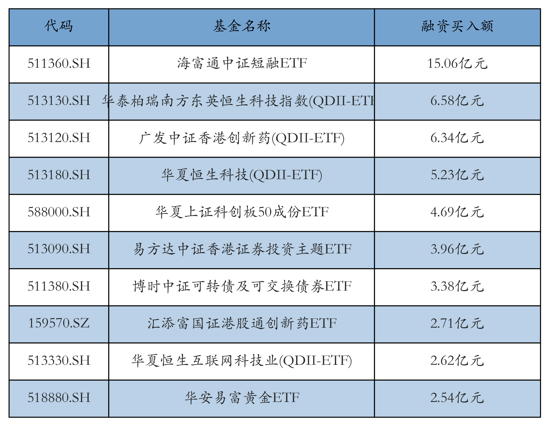 6月19日ETF融资买入额前三位分别为:海富通中证短融ETF(15.06亿元)、华泰柏瑞南方东英恒生科技指数(QDII-ETF)(6.58亿元)和广发中证香港创新药(QDII-ETF)(6.34亿元),前10具体见下表: