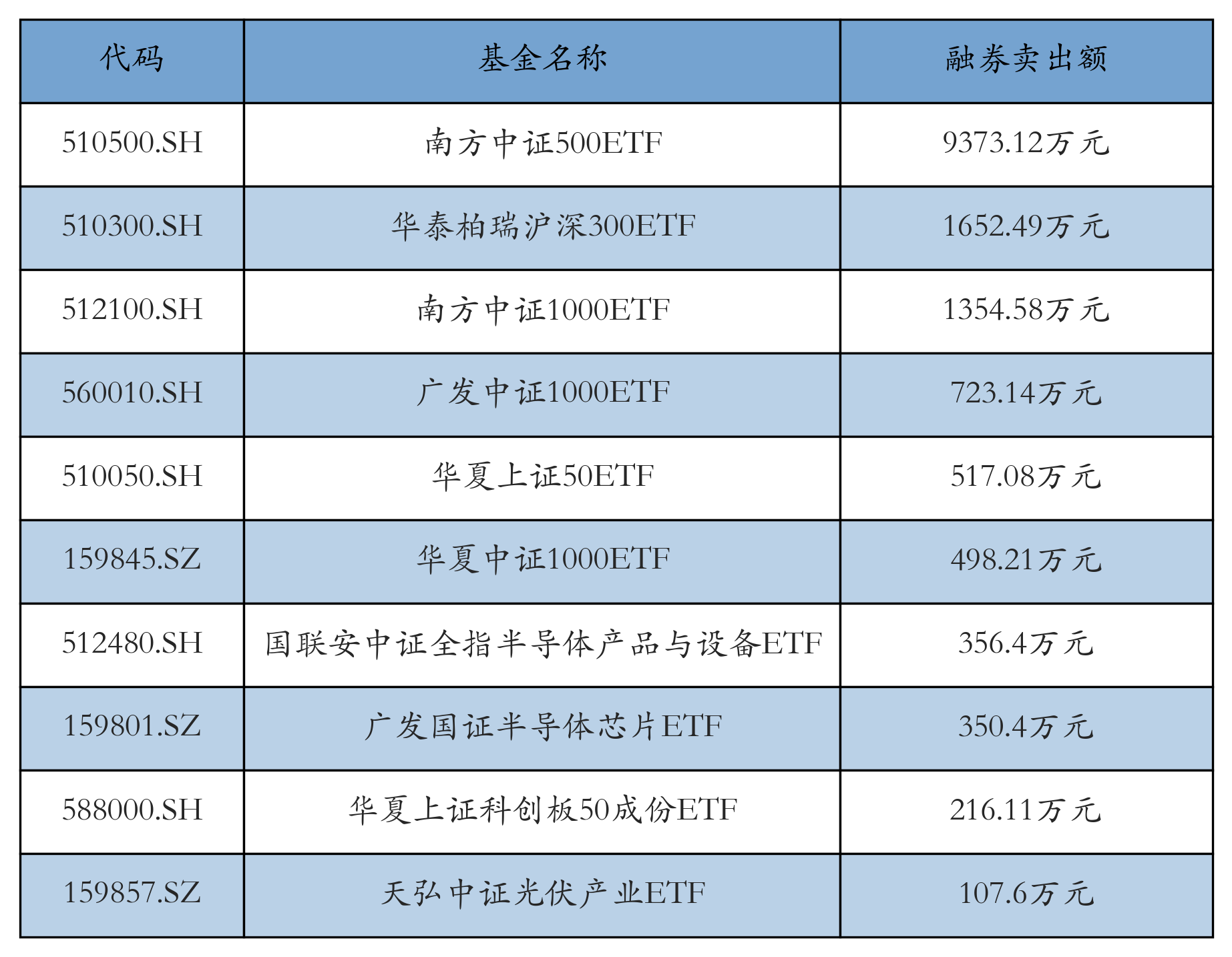 6月19日ETF融券卖出额前三位分别为:南方中证500ETF(9373.12万元)、华泰柏瑞沪深300ETF(1652.49万元)和南方中证1000ETF(1354.58万元),前10具体见下表: