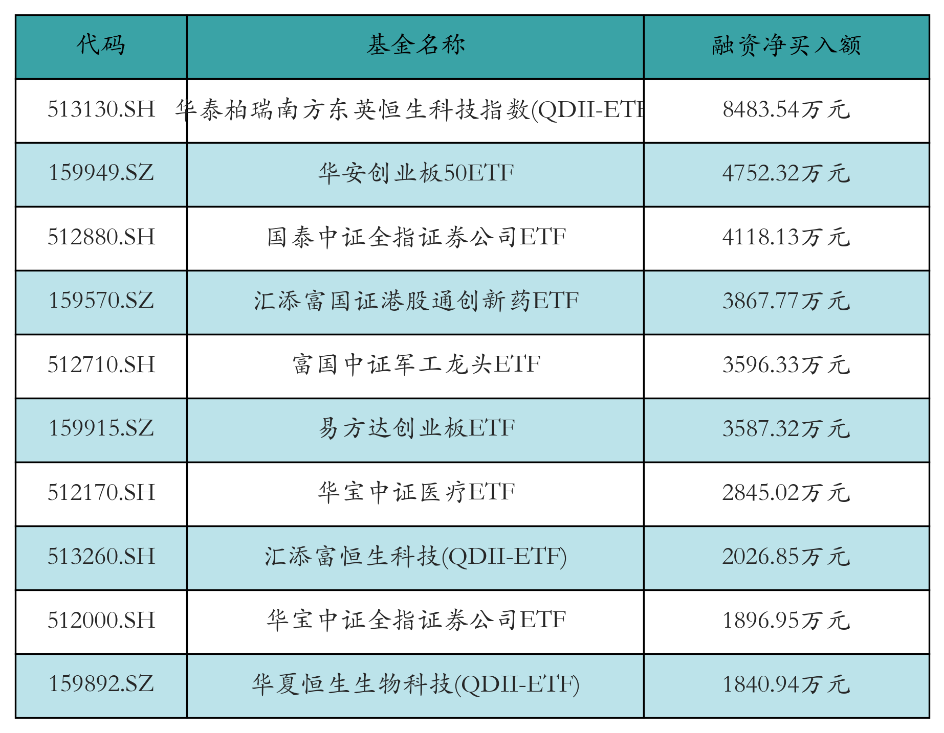 6月19日ETF融资净买入额前三位分别为:华泰柏瑞南方东英恒生科技指数(QDII-ETF)(8483.54万元)、华安创业板50ETF(4752.32万元)和国泰中证全指证券公司ETF(4118.13万元),前10具体见下表: