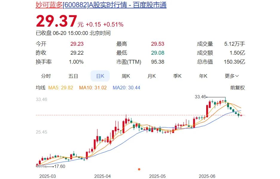 截至6月20日收盘,妙可蓝多市值为150亿元。