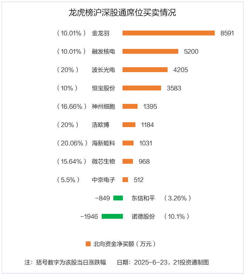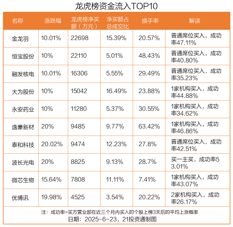 6月23日,上证指数上涨0.65%,深证成指上涨0.43%,创业板指上涨0.39%。盘后龙虎榜数据显示,共有40只个股因当日异动登上龙虎榜,资金净流入最多的是金龙羽(002882.SZ),达2.27亿元。