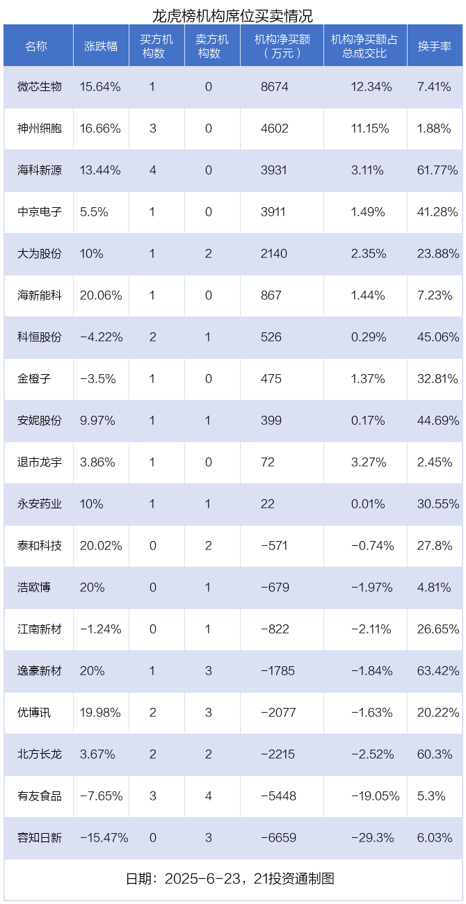 其中,机构净买入金额最多的是微芯生物(688321.SH),当日收盘上涨15.64%,换手率为7.41%。