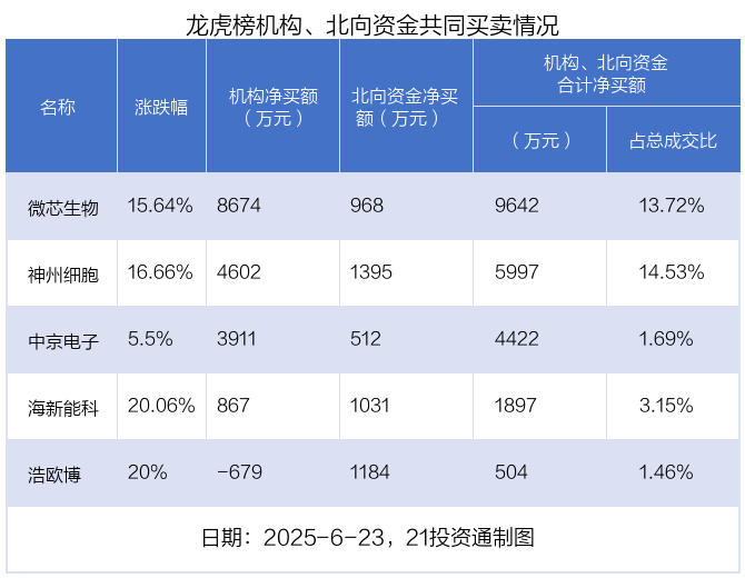 值得注意的是,机构和北向资金共同净买入了神州细胞、海新能科、微芯生物、中京电子等4股;在浩欧博上出现分歧,机构净卖出浩欧博679.18万元,北向资金净买入1183.54万元。