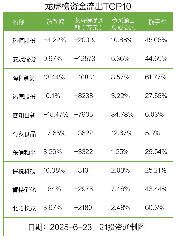 而龙虎榜中资金净流出最多的是科恒股份(300340.SZ),被净卖出为2亿元,占总成交金额的10.88%。科恒股份收盘下跌4.22%,换手率为45.06%。