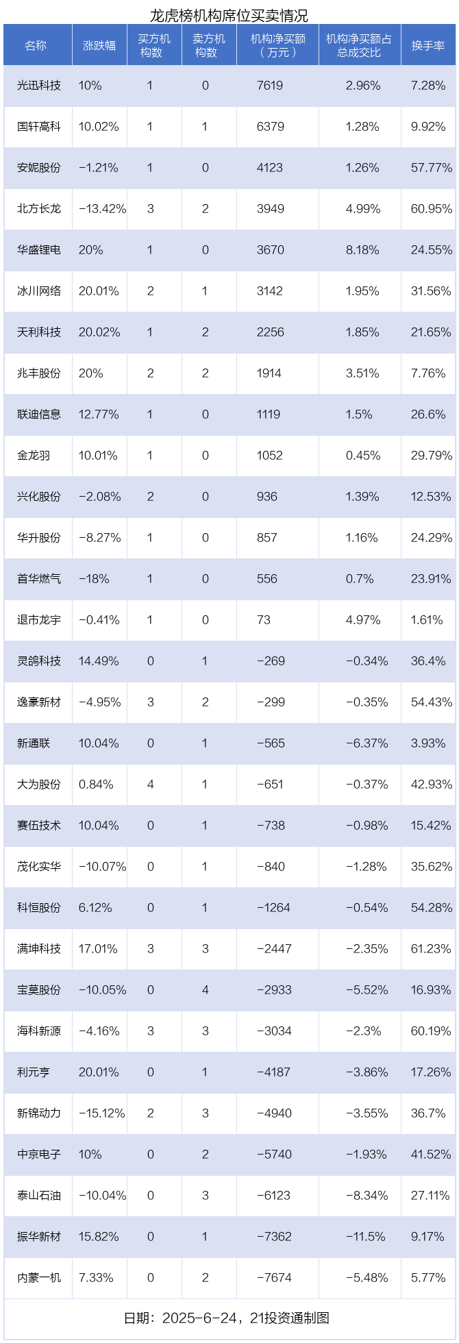 6月24日,30只个股龙虎榜出现了机构的身影,机构合计净卖出1.14亿元。具体来看,机构净买入14股,净卖出16股。