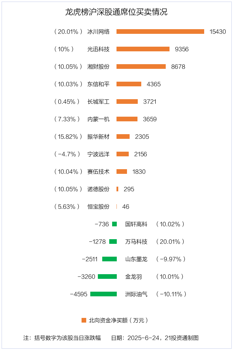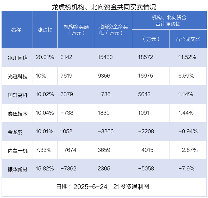 值得注意的是,机构和北向资金共同净买入了冰川网络、光迅科技等2股;在内蒙一机,振华新材,赛伍技术,国轩高科,金龙羽上出现分歧,机构净卖出内蒙一机7674.18万元,北向资金净买入3659.03万元;机构净卖出振华新材7362.36万元,北向资金净买入2304.62万元;机构净卖出赛伍技术738.44万元,北向资金净买入1829.69万元;机构净买入国轩高科6378.55万元,北向资金净卖出736.24万元;机构净买入金龙羽1051.68万元,北向资金净卖出3260.13万元。
