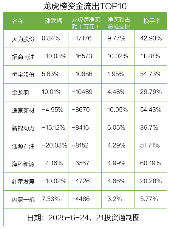 而龙虎榜中资金净流出最多的是大为股份(002213.SZ),被净卖出为1.72亿元,占总成交金额的9.77%。大为股份收盘上涨0.84%,换手率为42.93%。