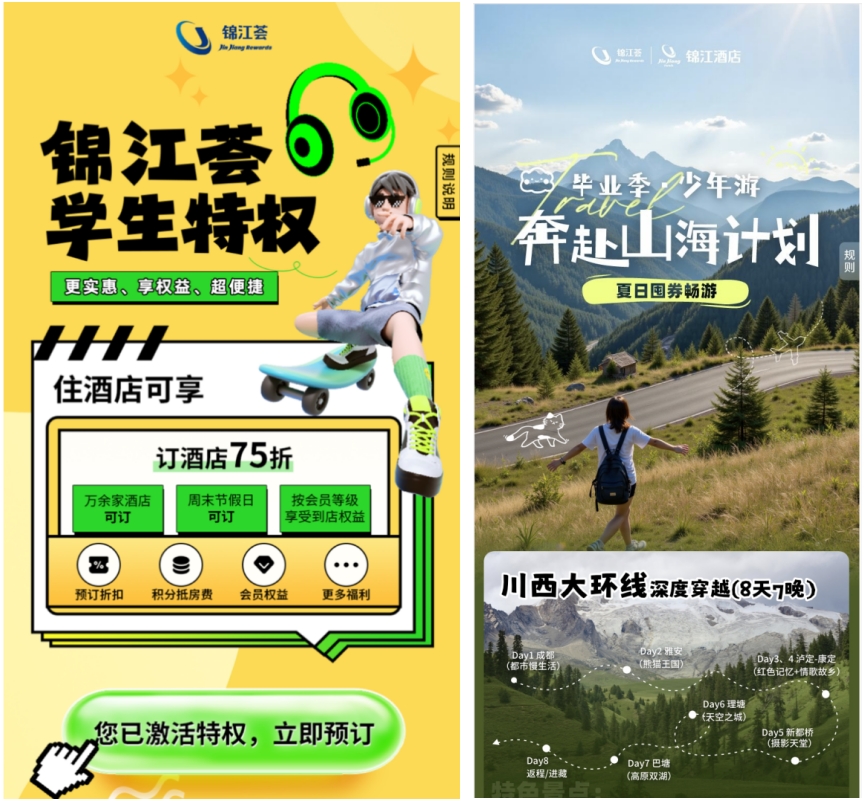 随着暑期临近,锦江酒店(中国区)在学生特权基础上推出了“毕业季·少年游——奔赴山海计划”,为毕业生打造青春旅行新体验:以旅游路线+高灵活度酒店通兑券为核心,覆盖避暑、滨海、山野等热门场景,满足多元出行需求。