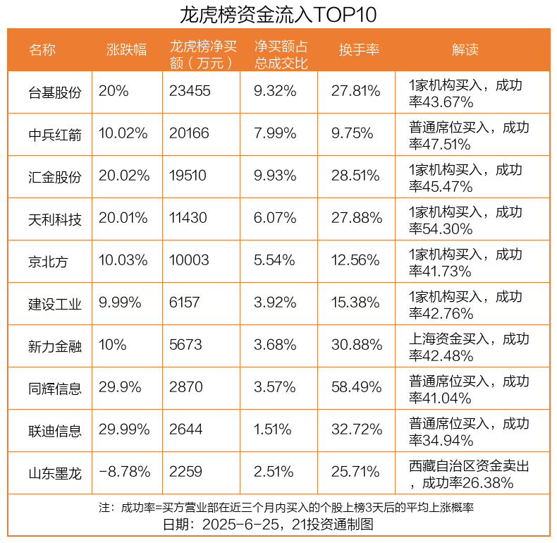 56只上榜的龙虎榜个股中,22只个股被净买入,34只个股被净卖出。其中,资金净买入最多的是台基股份,达2.35亿元,占总成交金额的9.32%。台基股份当日收盘上涨20%,换手率为27.81%。